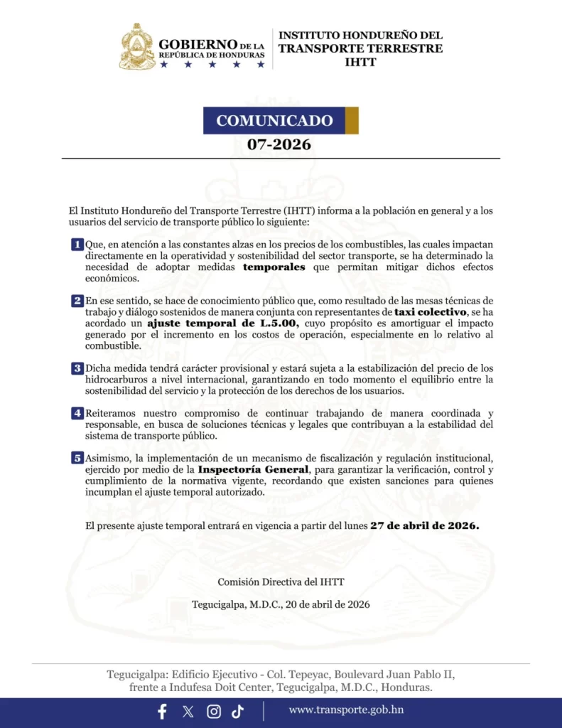 El Instituto Hondureño del Transporte Terrestre (IHTT), anunció un ajuste temporal de cinco lempiras en la tarifa del servicio de taxis colectivos, como medida para contrarrestar el impacto de las constantes alzas en los precios de los combustibles.