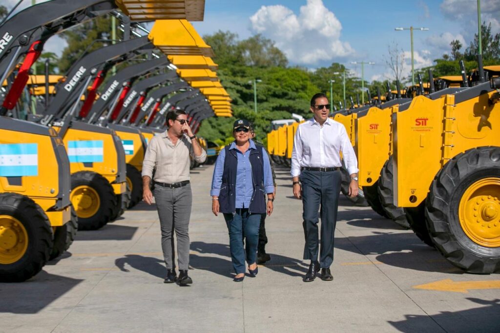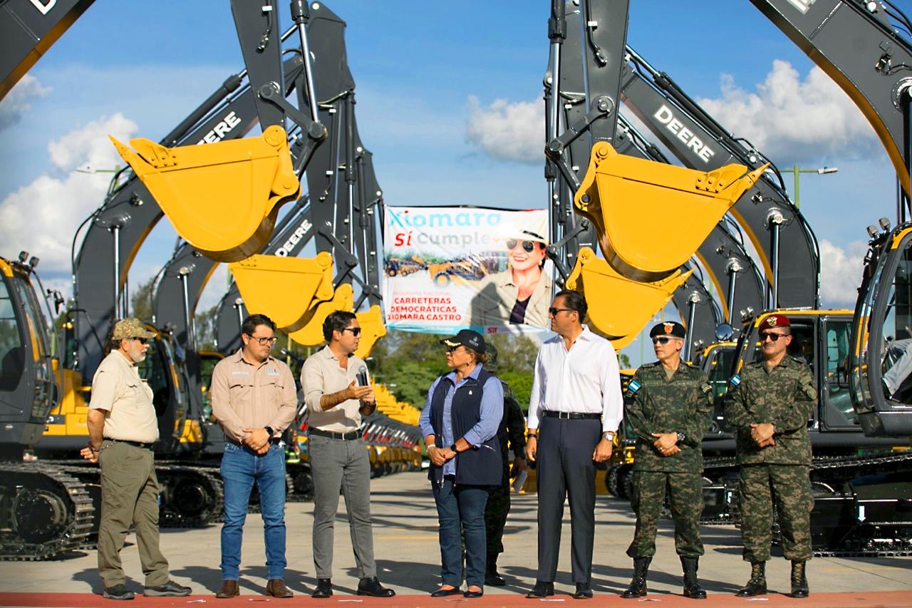 La titular del Ejecutivo entregó a la SIT, que trabajará en coordinación con el Fondo Hondureño de Inversión Social (FHIS), 23 motoniveladoras, 23 retroexcavadoras, 23 vibro, compactadoras, ocho excavadoras y 10 volquetas, para un total de 87 máquinas.