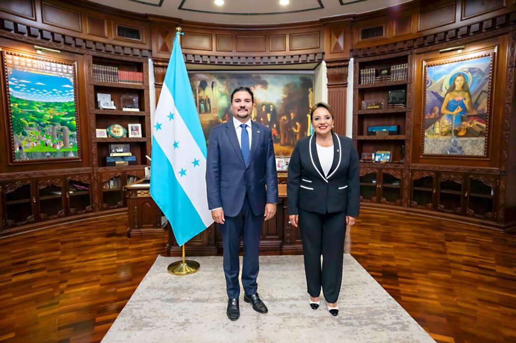 El primer acto del nuevo canciller fue acompañar a la presidenta Castro en la ceremonia de recibimiento de las cartas credenciales de cuatro nuevos embajadores ante el pueblo y gobierno de Honduras.