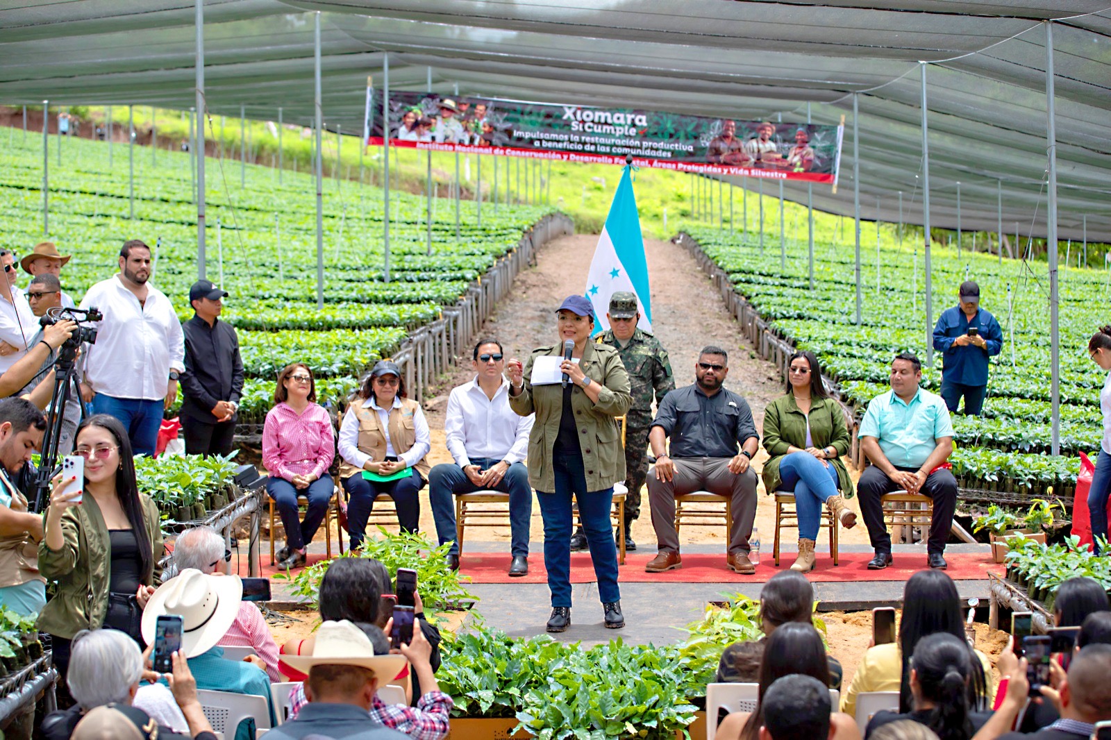 En la entrega la mandataria benefició a los primeros 1,700 productores de Copán, Ocotepeque y Lempira. El proyecto Agrobosque tiene un costo inicial de 460 millones de lempiras provenientes de fondos nacionales.